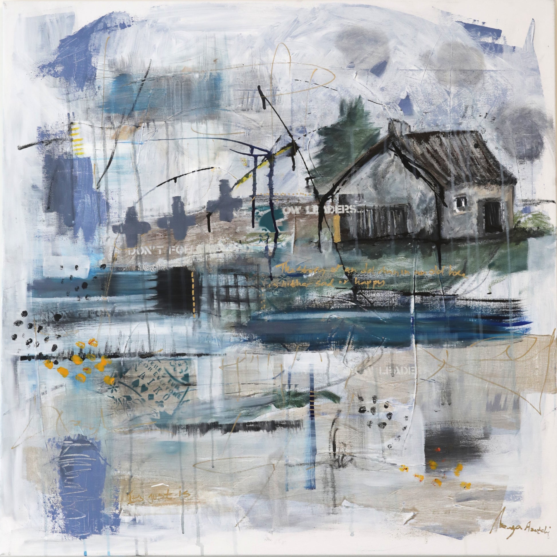 Abstract acrylic painting of a house in the field on canvas 80x80 cm (31.5"x31.5")