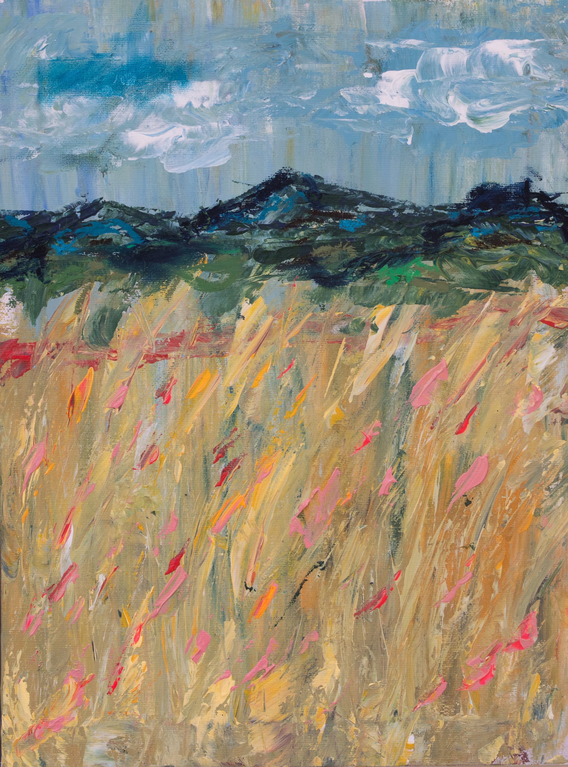 Acrylic painting of a field with mountains in the background on canvas 30x40 cm (11.8"x15.7")